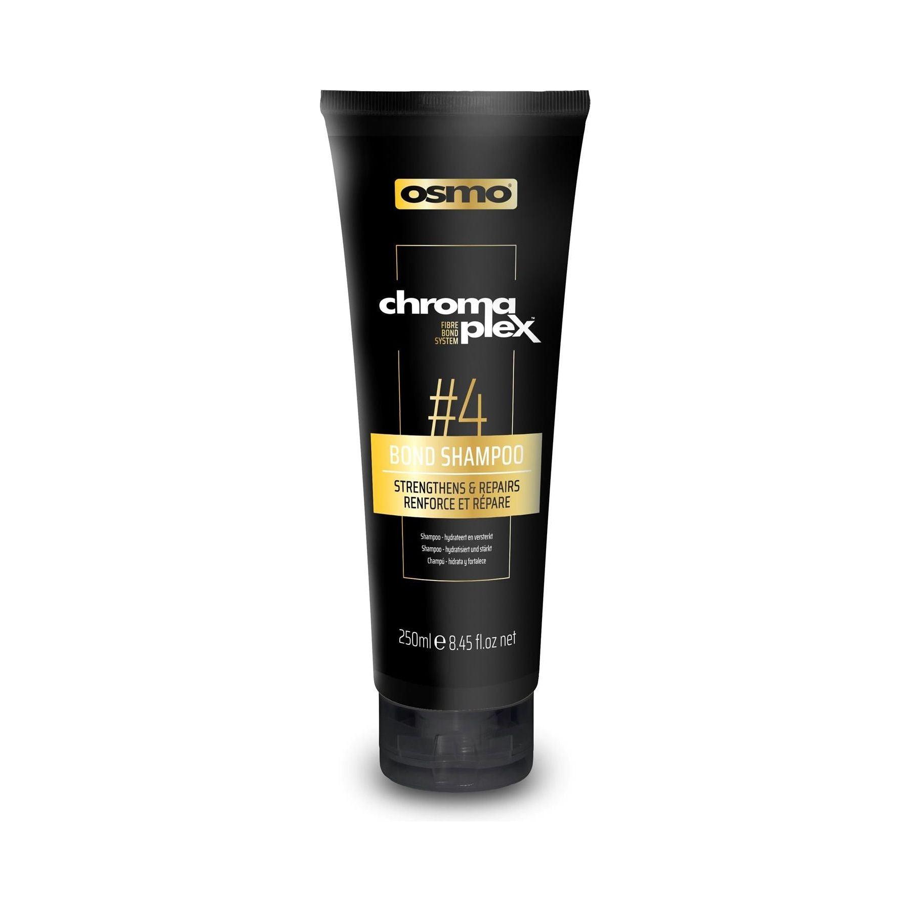 Osmo Chromaplex Bond Shampoo #4 in a 250ml bottle is a gentle shampoo designed to protect and strengthen hair bonds. It works to rebuild and repair damaged hair, leaving it healthy, shiny, and more resilient after color or chemical processes.
